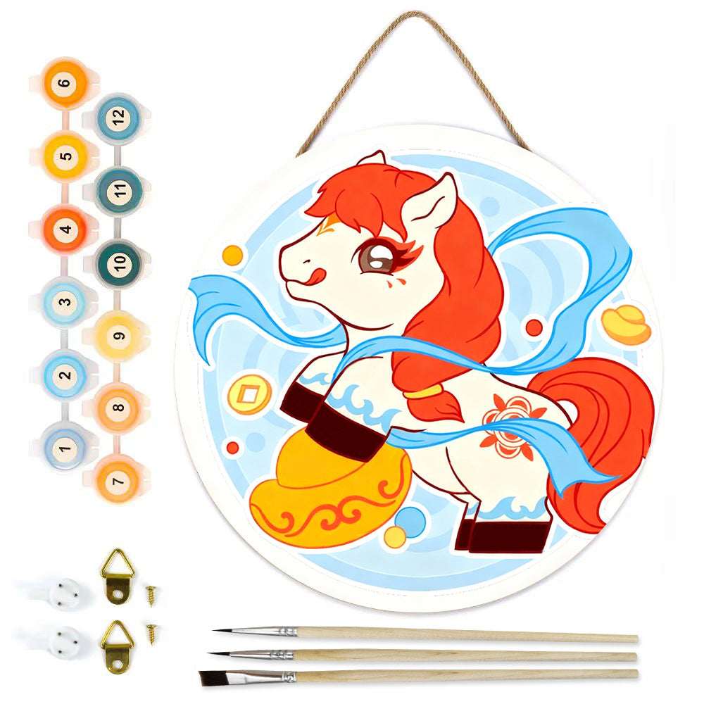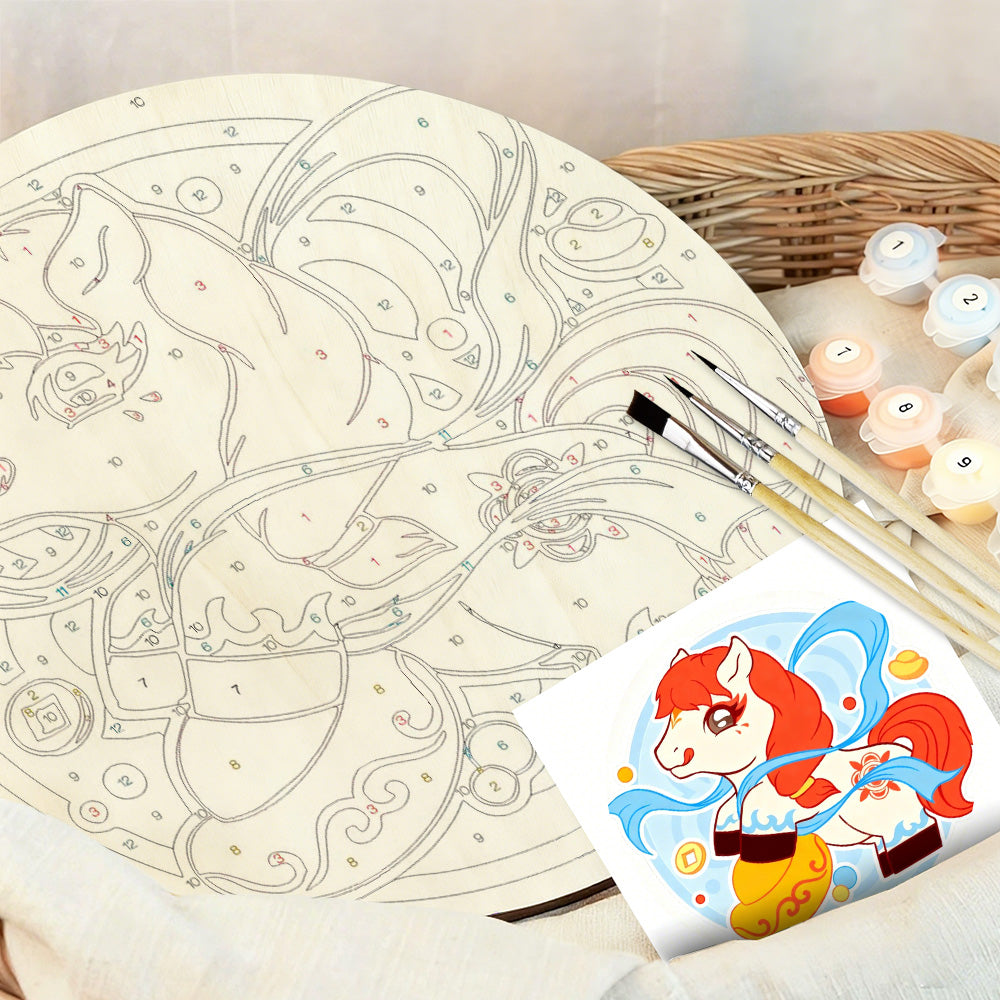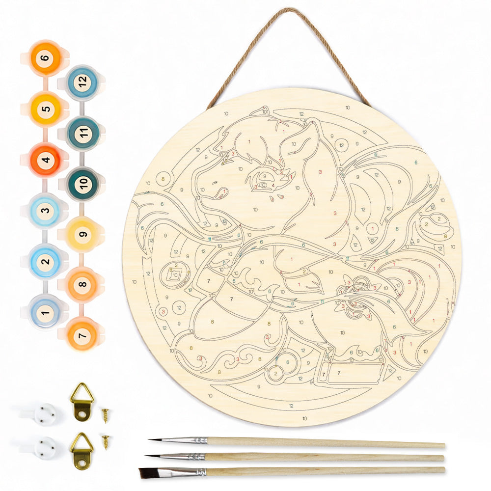 Pintar por Números en Rodaja de Madera - Caballo Cabalgando entre Nubes y Símbolos de Riqueza