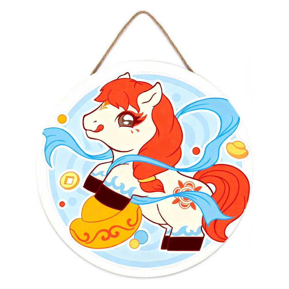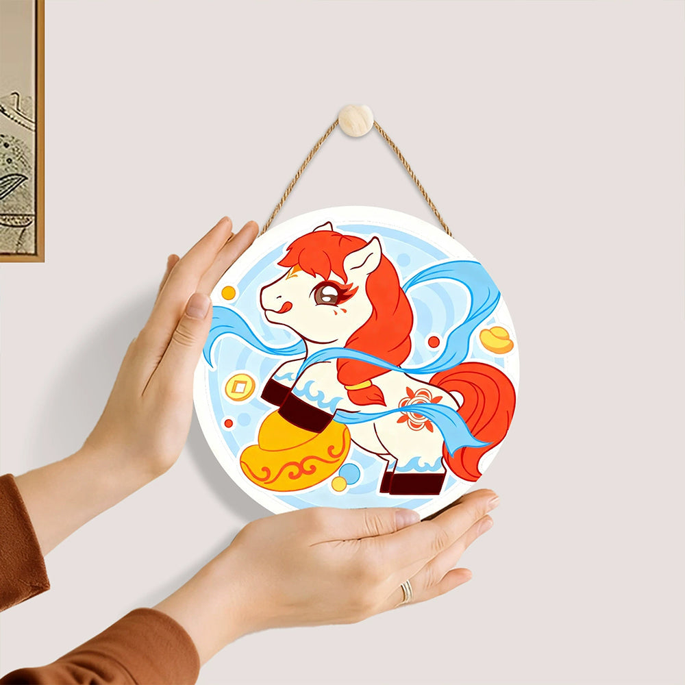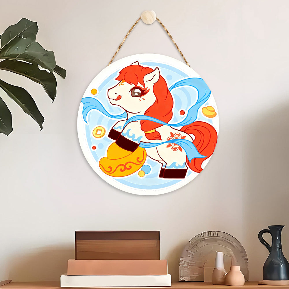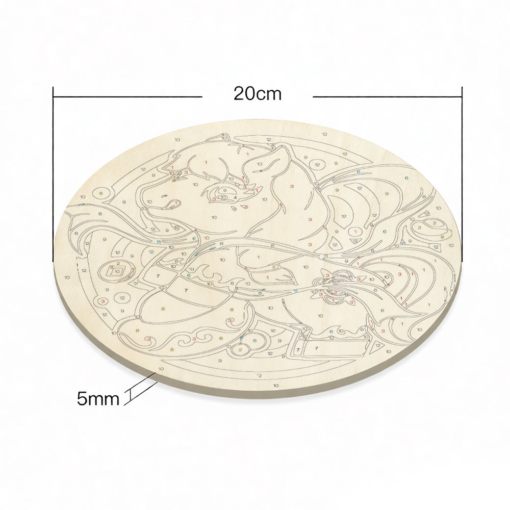 Pintar por Números en Rodaja de Madera - Caballo Cabalgando entre Nubes y Símbolos de Riqueza