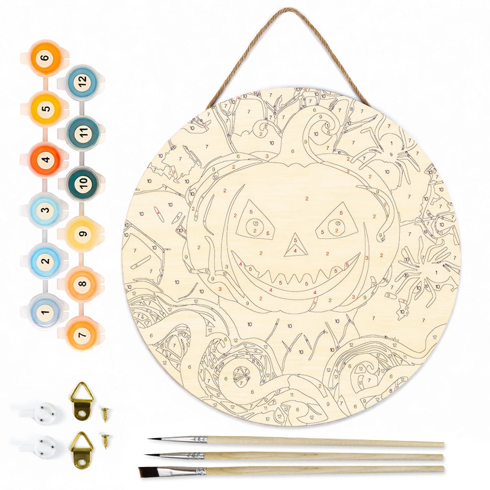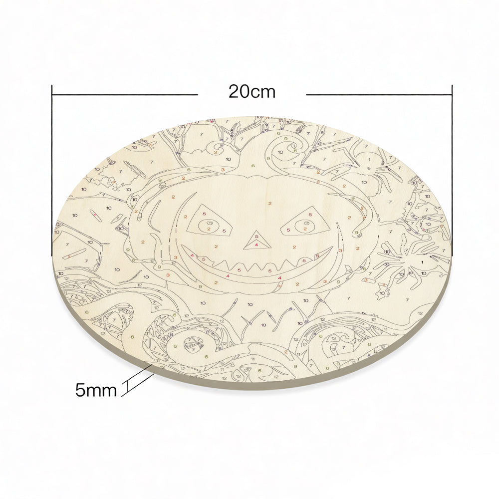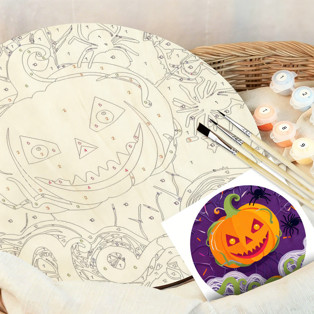 Pintar por Números en Rodaja de Madera - Calabaza Malvada y Arañas Negras