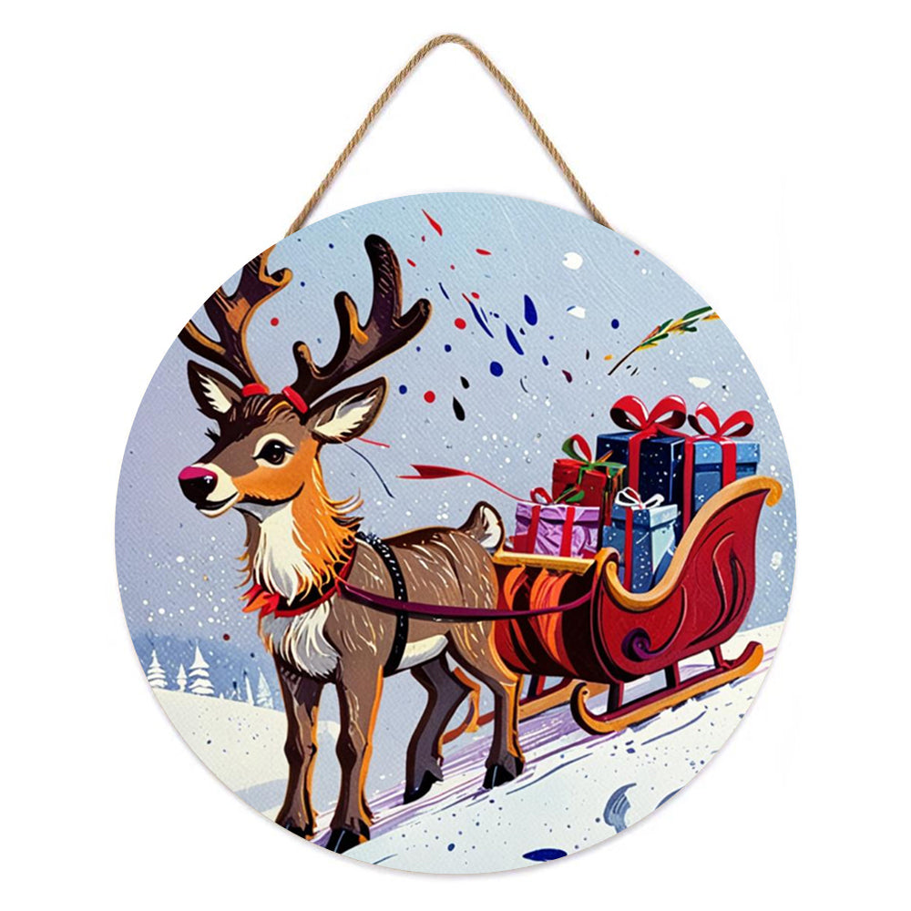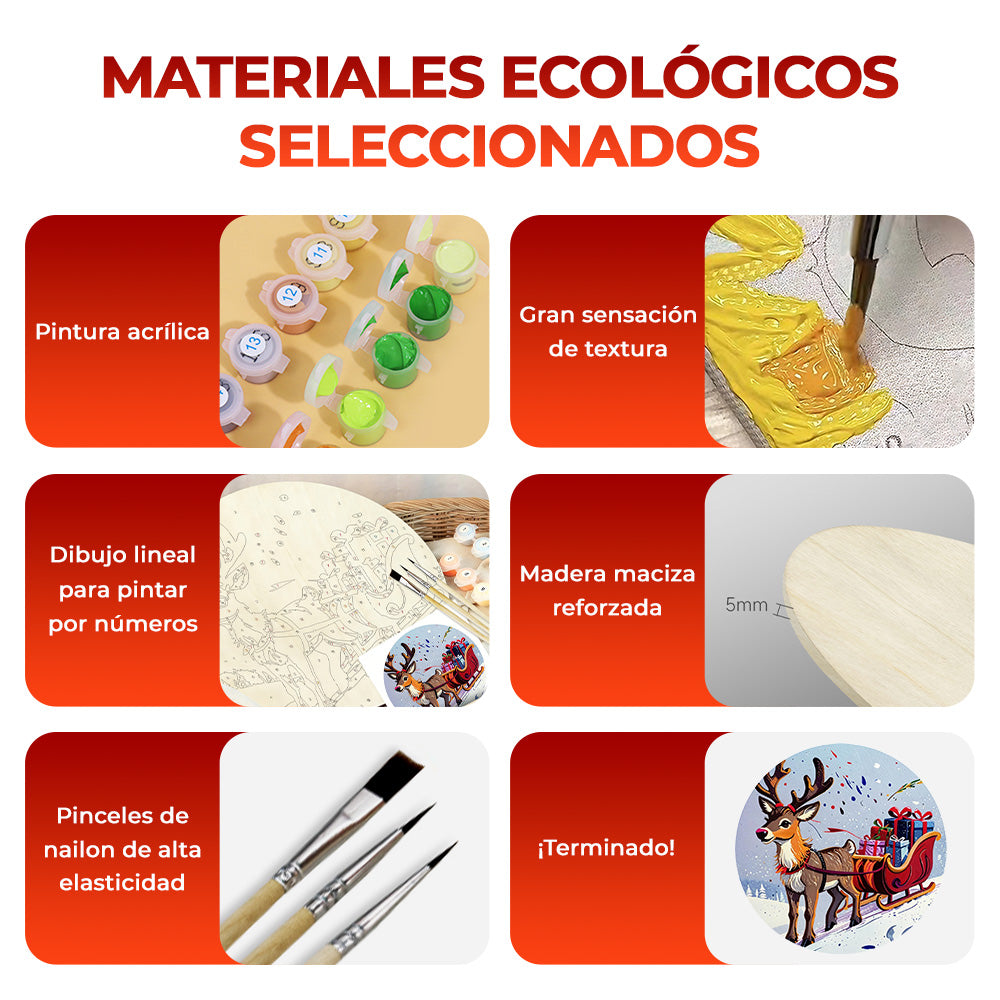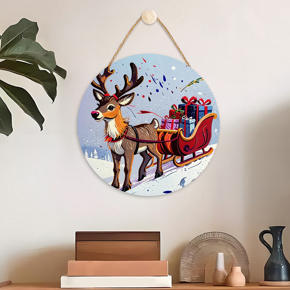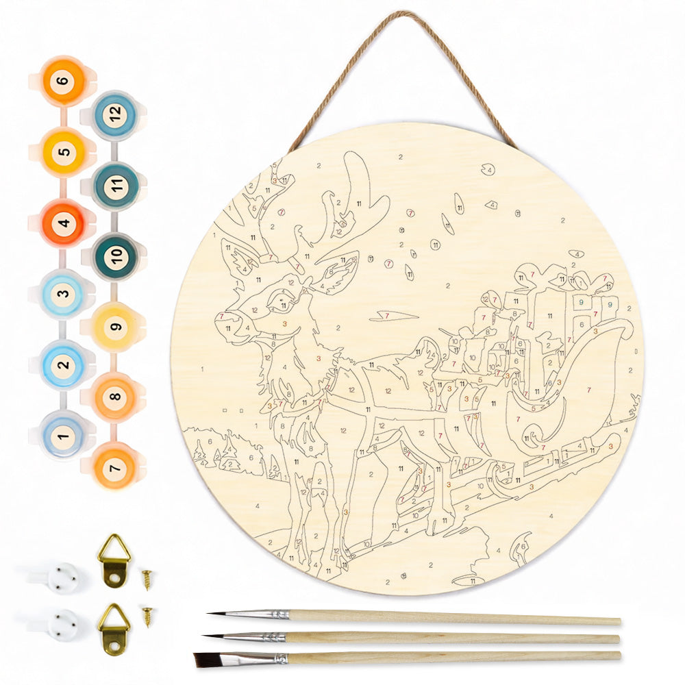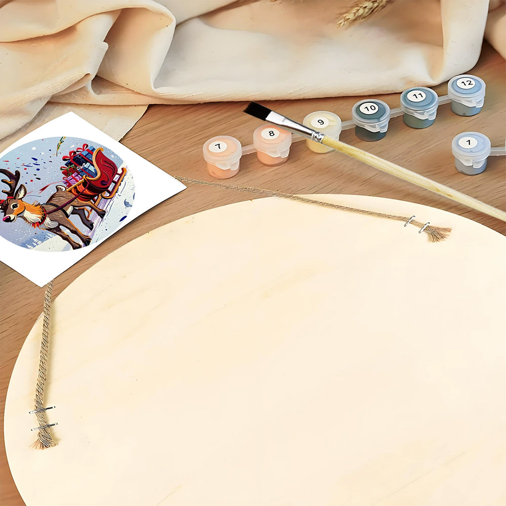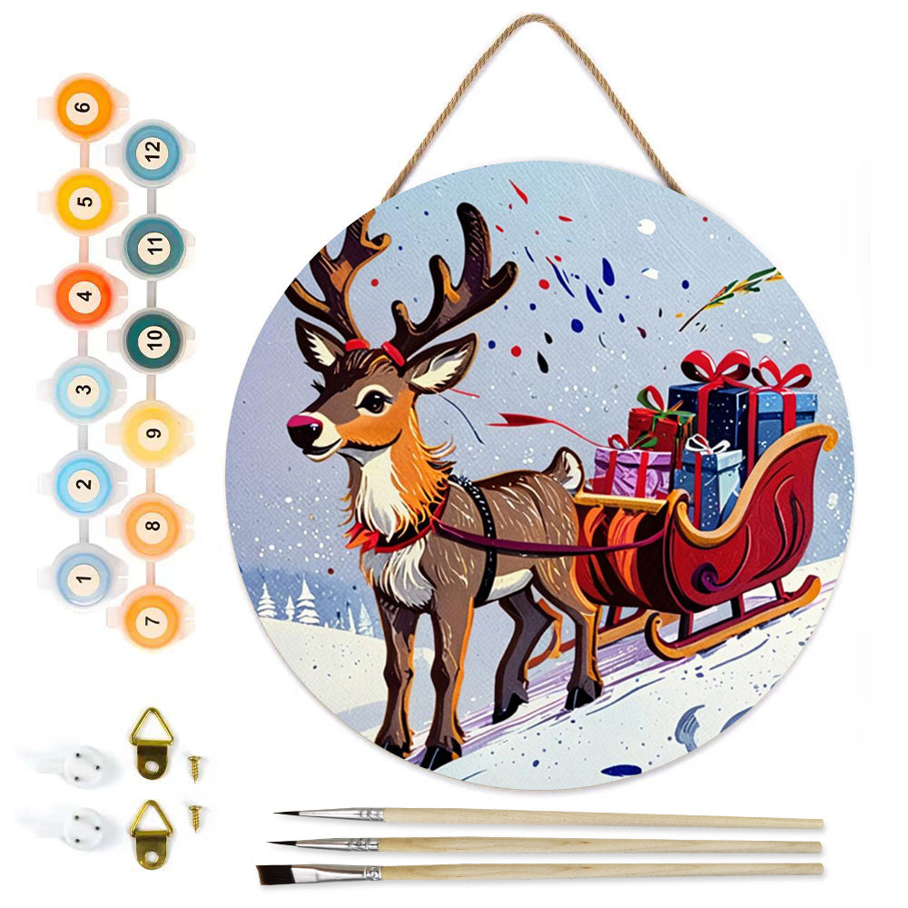 Pintar por Números en Rodaja de Madera - Reno Tirando de Regalos de Navidad