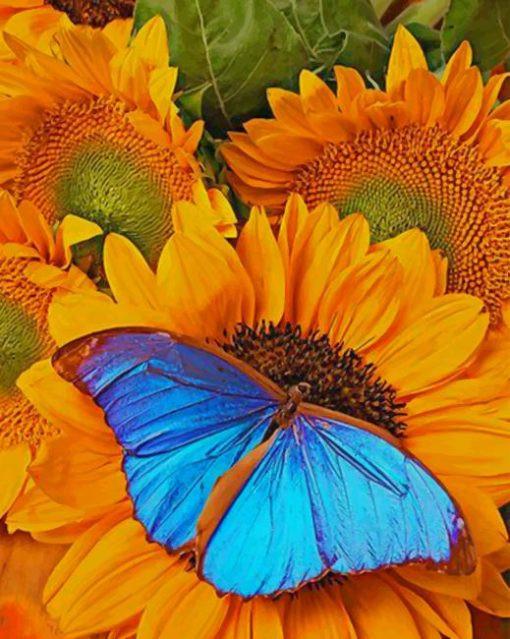 Mariposa Morpho Azul Parada sobre Girasoles Pintar por Números
