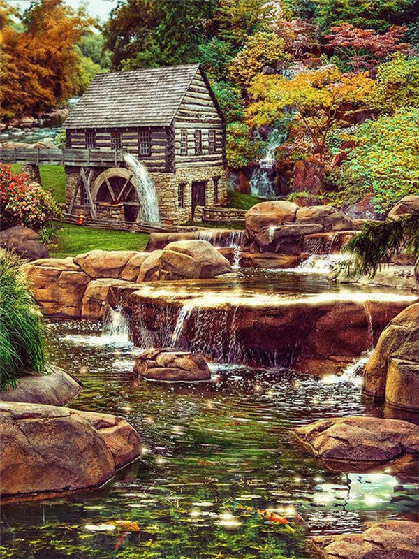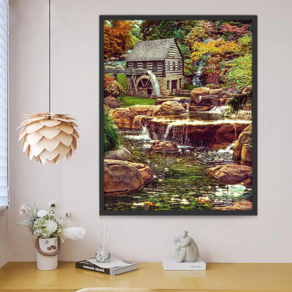 Arroyo y Casa con Rueda Hidráulica Pintar por Números