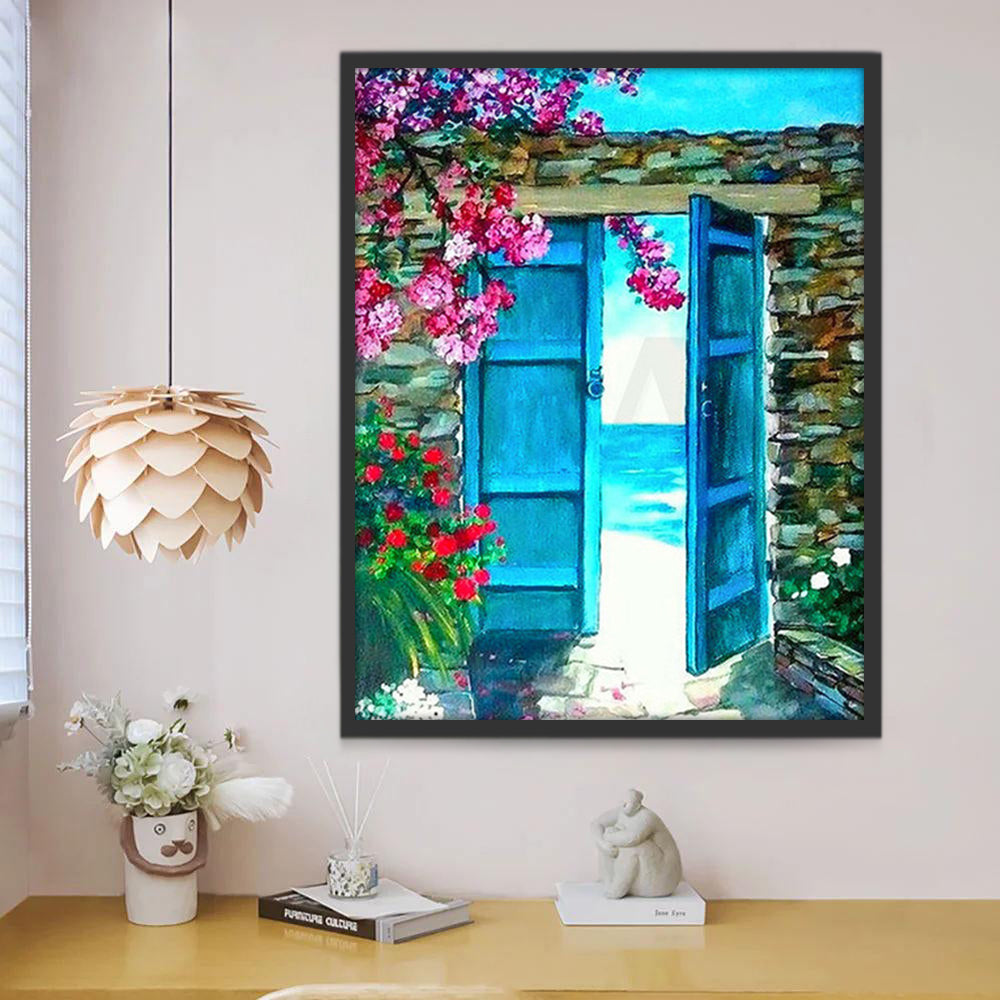 Flores y Puerta Azul en el Patio Pintar por Números